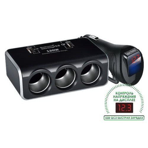 Разветвитель прикуривателя 12/24V на 3 гнезда 120W + 2 х USB разъема 5V-3.0 А, 2.1 А + вольтметр